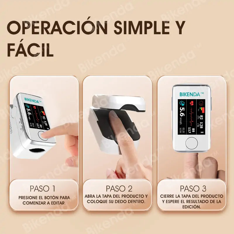 Completamente indoloro: simplemente coloca tu dedo índice sobre el Bikenda™ y, en 5-8 segundos, mostrará tus niveles de glucosa, oxígeno y hasta tu ritmo cardíaco. ¡Rápido y fácil!